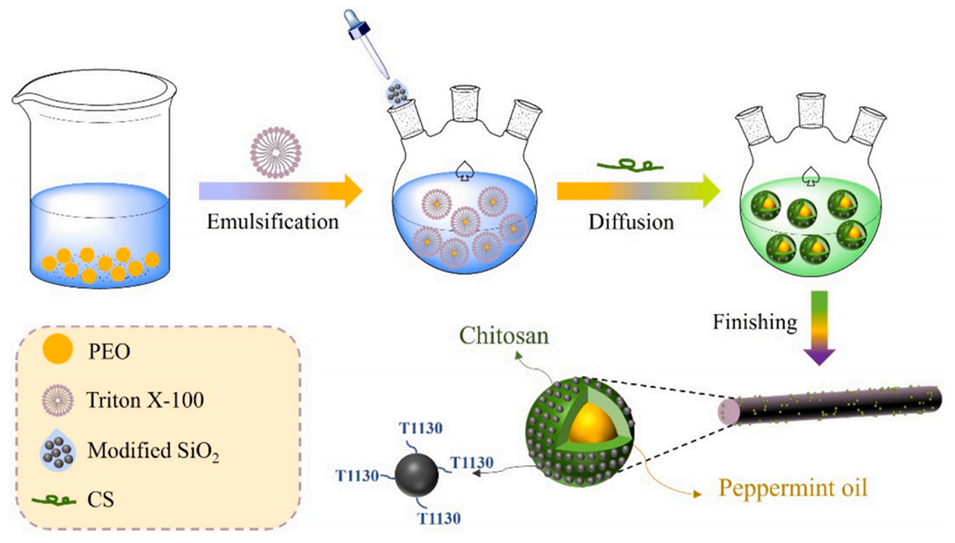 2、通过单凝聚法将紫外线吸收剂T1130改性二氧化硅与壳聚糖结合形成壳层,薄荷精油(PEO)作为芯材,兼具生物相容性与抗菌性。