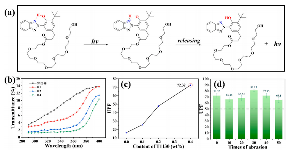 图8.(a)T1130的紫外吸收机理图;(b)不同T1130浓度织物涂层的紫外透射光谱;(c)不同T1130含量织物涂层UPF的变化;(d)不同磨损时间后织物涂层UPF的变化。