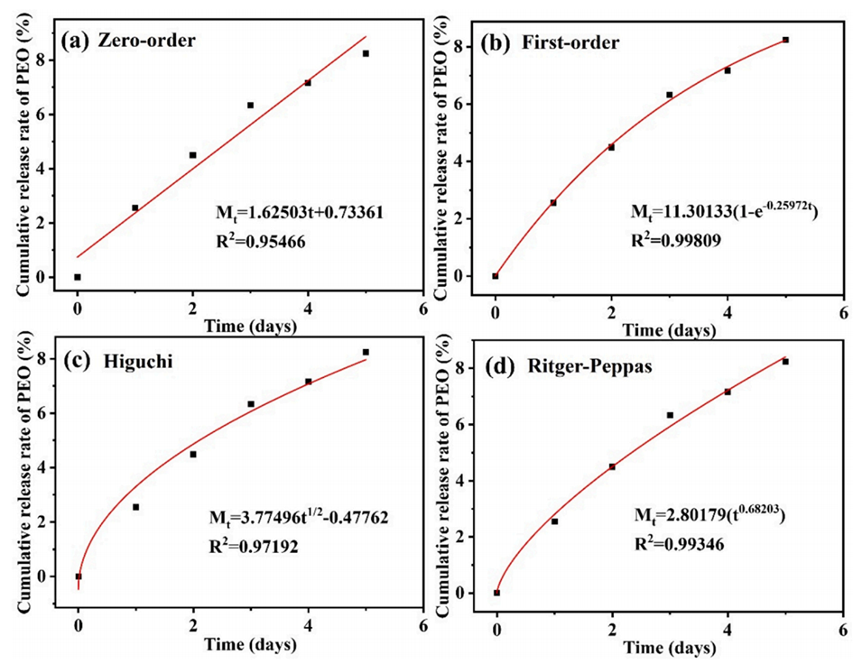 图7.不同模型拟合的释放曲线和相应动力学模型的相关系数:(a)零级方程;(b)一级方程;(c)Higuchi方程;(d)Ritger-Peppas方程。
