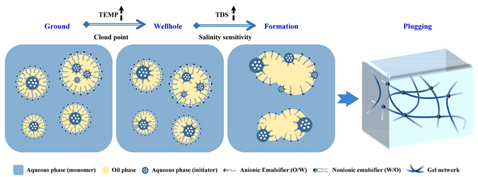 3、高温盐响应触发:将制备好的W/O/W双乳液置于高温高盐环境中(如油藏条件),当温度超过内层非离子乳化剂的浊点,且盐度达到临界浓度时,乳液结构被破坏,内水相中的引发剂释放出来,触发外水相中单体的聚合反应,形成具有封堵能力的水凝胶网络。