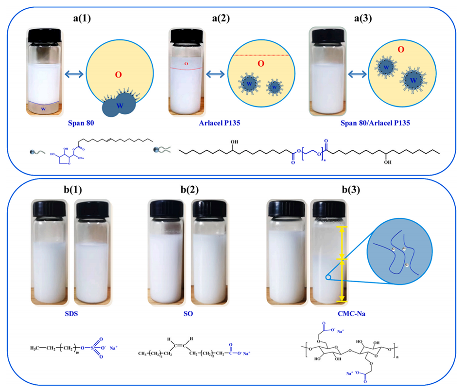 图2.乳化剂的选择(a(1):乳液耐温性(60℃),a(2):乳液稳定性(72h),a(3):乳液热稳定性(60℃,72h);b:盐度敏感性(左:清洁水的制备,右:以1:1的比例用地层水稀释的清洁水))。