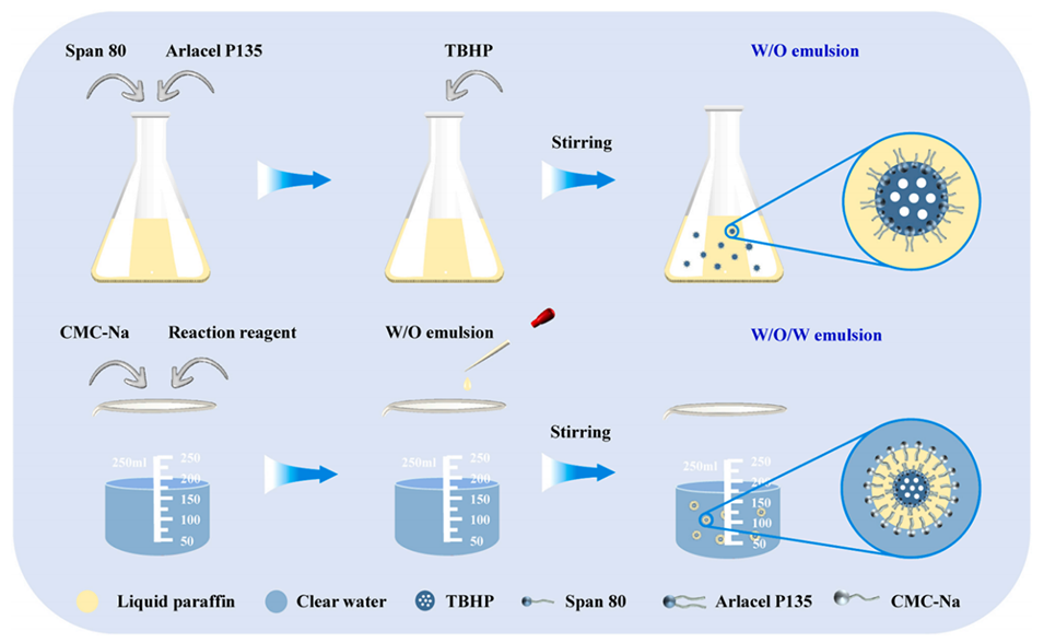 1、制备初级乳液(W/O):将内水相(引发剂溶液)与油相(液体石蜡)混合,加入油溶性乳化剂(如Span 80和Arlacel P135),通过搅拌形成稳定的油包水乳液。该乳液的稳定性依赖于乳化剂的协同作用。