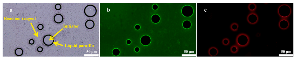 图6.W/O/W双乳液的微观结构(a:亮场;b:荧光场(水相);c:荧光场(油相)。