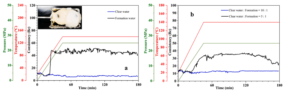 图8.W/O/W双乳液的增稠曲线(a:清洁水和地层水制备的比较(插入图片:在地层水条件下增稠后水凝胶包裹在旋转轴上);b:不同清洁水和地层水比例比较)。