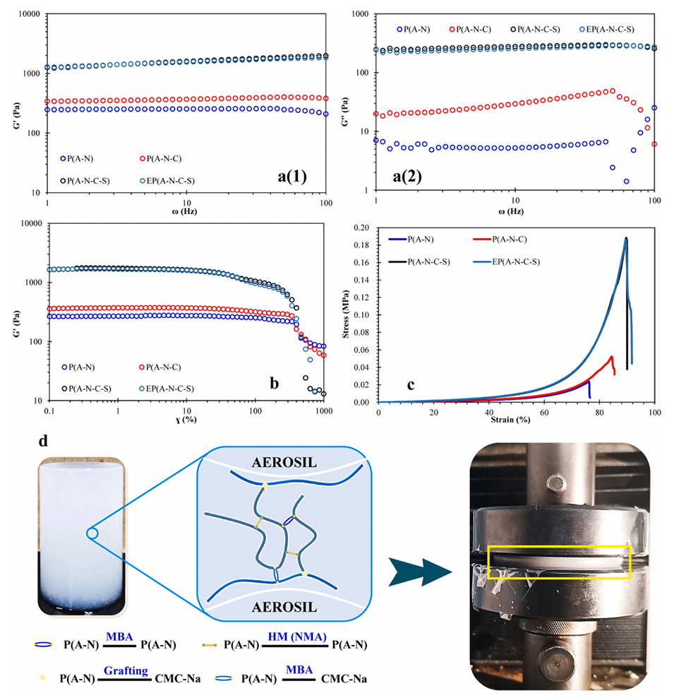 图10.水凝胶的力学性能(a:粘弹性模量的振荡频率扫描;b:弹性模量的振幅频率扫描;c:单轴压缩下的应力-应变曲线;d:环境响应型智能水凝胶EP(A-N-C-S)的结构示意图)。