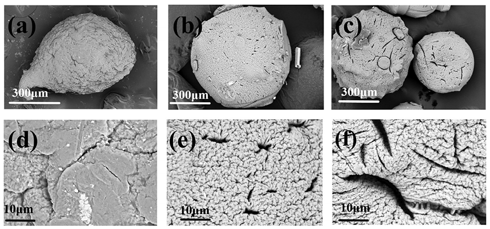 图2.整体SEM图像:(a)SC0.3-P4-PAM1,(b)SC0.3-P4-PDM1.5和(c)SC0.3-P4-PAM2;表面SEM图像:(d)SC0.3-P4-PAM1,(e)SC0.3-P4-PDM1.5和(f)SC0.3-P4-PAM2。