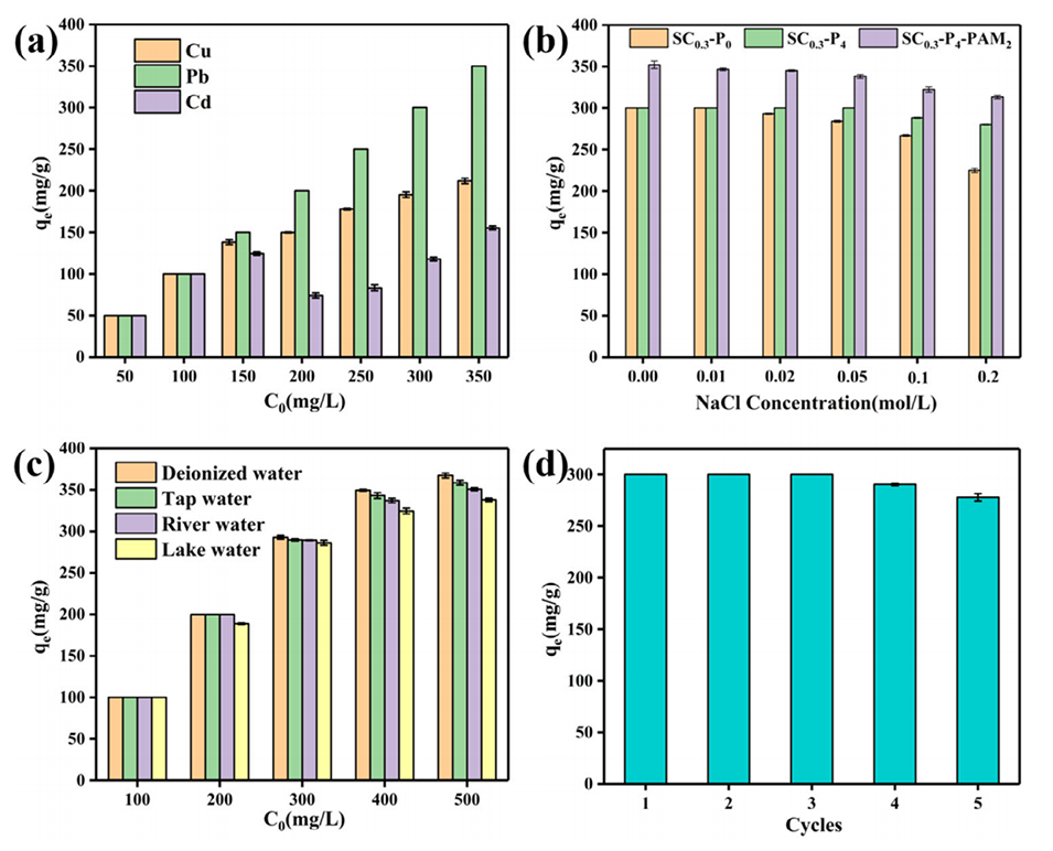 图5.(a–c)模拟水生环境对SC0.3-P4-PAM2样品吸附Pb2+的影响:(a)共存离子(25°C,pH=5),(b)NaCl浓度(25°C,pH=5,C0=400mg/L),(c)不同水体(25°C,pH=5);(d)SC0.3-P4-PAM2吸附Pb2+的可重复性(25°C,pH=5,C0=300 mg/L)。