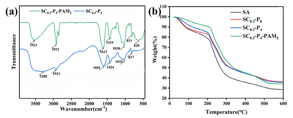 图3.(a)SC0.3-P4和SC0.3-P4-PAM2的FT-IR光谱。(b)SA、SC0.3-P0、SC0.3-PS4和SC0.3-P4-PAM2的TGA曲线。