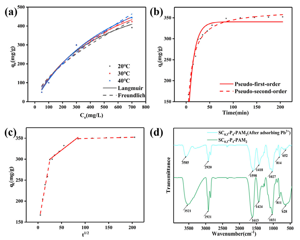 图6.(a)SC0.3-P4-PAM2在pH为5的水溶液中对Pb2+的吸附等温线和拟合曲线,(b)SC0.3-P4-PAM2对Pb2+的吸附动力学和拟合曲线(pH=5,25°C),(c)颗粒内扩散曲线(pH=5,25°C),(d)SC0.3-P4-PAM2吸附Pb2+前后的FT-IR光谱。