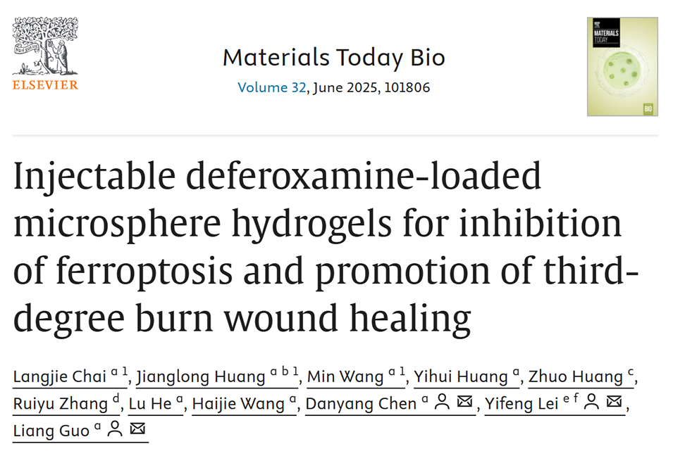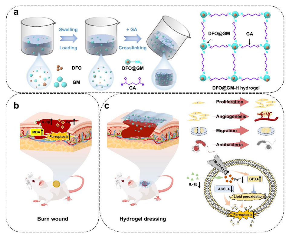 在慢性三度烧伤创面中,高水平的炎症因子(如IL-1β)会导致周围细胞铁死亡,从而延迟烧伤创面的愈合过程。近期,武汉大学中南医院整形美容科主任医师郭亮、陈丹洋等人开发了一种可注射的去铁胺(DFO)负载明胶微球水凝胶(DFO@GM-H),用于抑制铁死亡并促进三度烧伤创面的愈合。该研究通过将DFO包载于明胶微球中并进行温和交联反应,制备出具有自愈性和可注射性的水凝胶,能够长效缓释DFO,克服其体内半衰期短的缺陷,并在体内外实验中展现出良好的抗菌、抗炎和促进创面愈合的效果。相关研究以“Injectable deferoxamine-loaded microsphere hydrogels for inhibition of ferroptosis and promotion of third-degree burn wound healing”为题目,发表在期刊《Materials Today Bio》上。