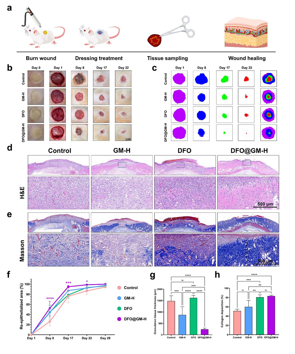5、大鼠三度烧伤模型证实,DFO@GM-H通过调控铁死亡通路、增强胶原沉积和血管生成,显著加速创面愈合(第8天再上皮化面积达52.3%)。