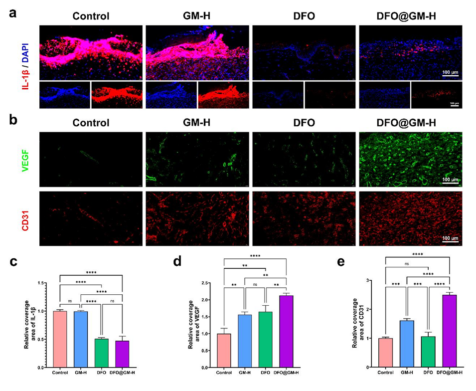 图7.烧伤创面炎症与血管生成的免疫荧光染色及定量分析。