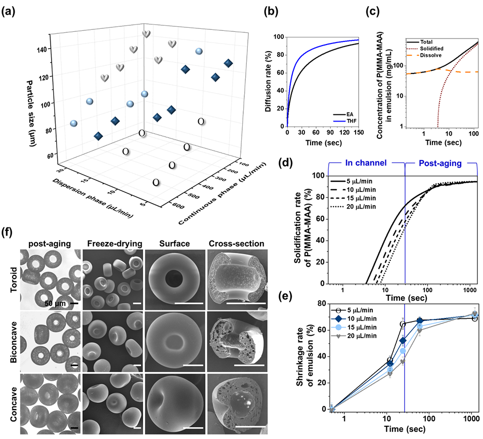 P(MMA-MAA)的固化速率受溶剂扩散速率(THF/EA比例)和流速影响。例如,低分散相流速(5 μL/min)下,快速固化导致液滴在微通道内受剪切力变形为环形结构;而高流速下,固化延迟则会形成球形或凹形。