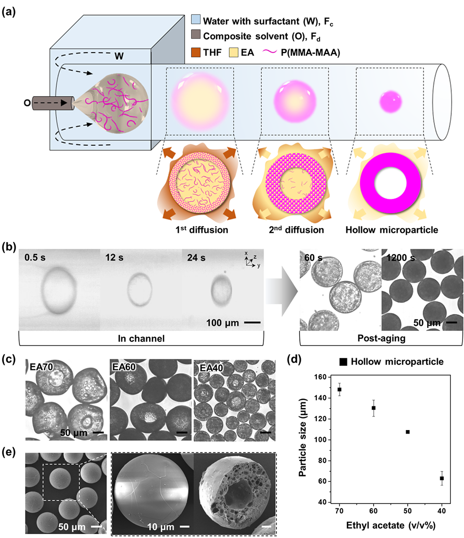 扩散诱导相分离:THF(快扩散)优先从液滴表面逸出,触发P(MMA-MAA)在界面固化形成壳层;EA(慢扩散)持续内迁,形成核壳结构。