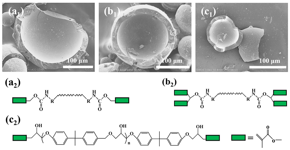 图3.使用不同UV固化预聚物制备的聚合物微球的SEM图像:两官能度和四官能度聚氨酯丙烯酸酯(a1,b1)以及环氧丙烯酸酯(c1);两官能度和四官能度聚氨酯丙烯酸酯(a2,b2)以及环氧丙烯酸酯(c2)的相应化学结构式。