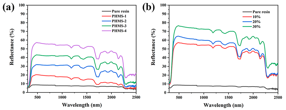 图7.(a)含10%不同核壳比PHMS的涂层的阳光反射率曲线;(b)含不同浓度PHMS-4微球的涂层的阳光反射率曲线。