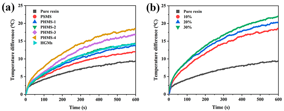 图9.(a)含10%不同核壳比PHMS的涂层的温差曲线;(b)含不同浓度PHMS-4微球的涂层的温差曲线。