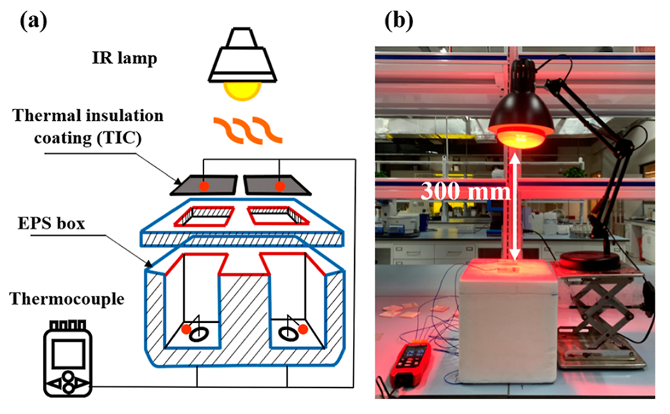 图8.(a)自制隔热测试装置示意图;(b)自制隔热测试装置的照片。