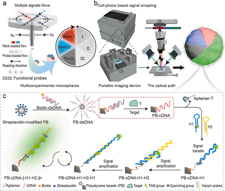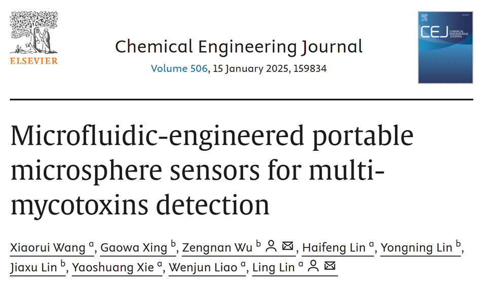 近期,北京工商大学林玲教授、清华大学吴增楠博士等人通过微流控技术开发了具有空间编码功能的多室水凝胶微球传感器,结合杂交链式反应实现单颗粒水平的多毒素同步检测。该技术利用双链DNA探针特异性捕获目标毒素,并通过便携式荧光成像装置实现信号快速解析,成功将黄曲霉毒素B1、赭曲霉毒素A和棒曲霉素的检测限降至亚纳克级。相关研究以“Microfluidic-engineered portable microsphere sensors for multi-mycotoxins detection”为题目,发表在期刊《Chemical Engineering Journal》上。