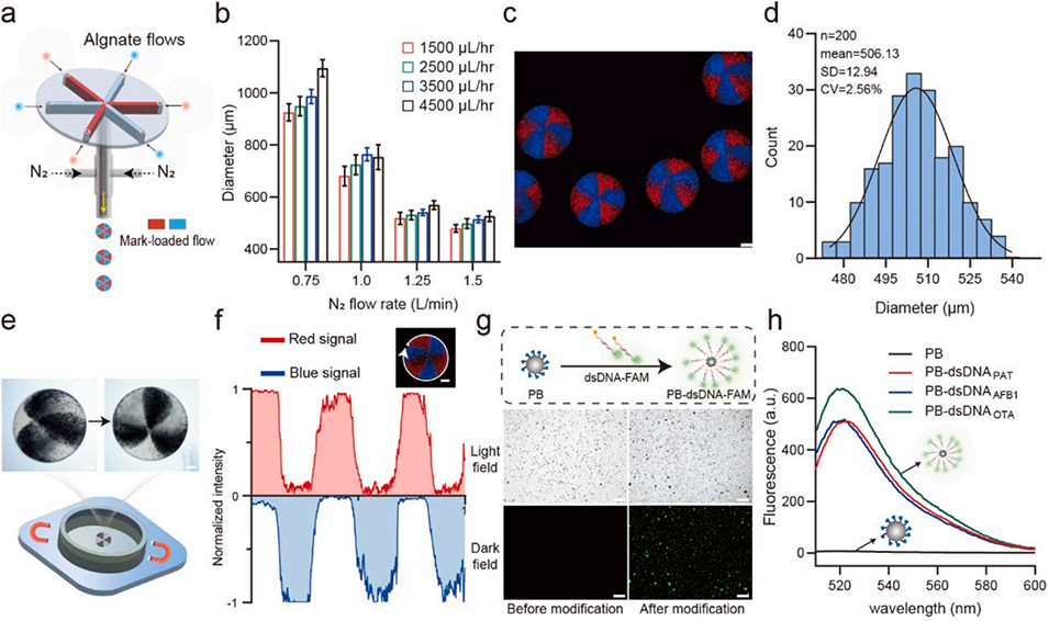 2、通过微流控技术构建具有生物相容性的水凝胶多室微球,其独立腔室可分别装载针对棒曲霉素、黄曲霉毒素B1和赭曲霉毒素A的特异性探针。