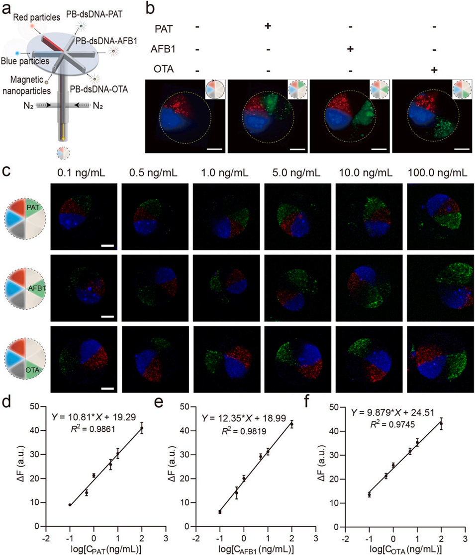 4、结合自研便携成像装置,仅需单一荧光标记即可通过空间分区解码三种毒素浓度,检测限达0.033-0.10 ng/mL,线性相关系数高于0.97。
