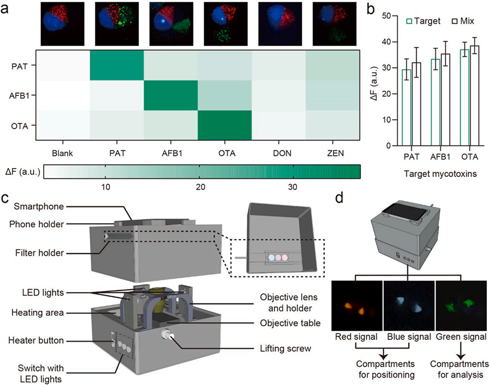图5.多组分检测特异性验证及便携式成像装置结构示意图