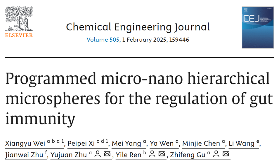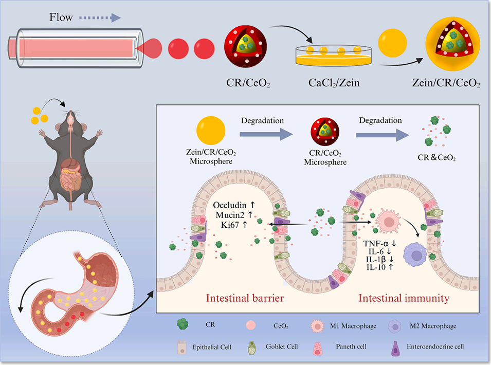 近期,南通大学附属医院顾志峰教授、朱玉娟研究员和徐州市第一人民医院副主任医师任义乐等人成功构建了一种基于玉米醇溶蛋白保护的层级微球递送系统,通过胃酸耐受外壳和肠道靶向时序释放策略,实现纳米酶快速清除活性氧、微藻长效调节肠道菌群的双重协同作用。相关研究以“Programmed micro-nano hierarchical microspheres for the regulation of gut immunity”为题发表于期刊《Chemical Engineering Journal》。通过体外巨噬细胞极化调控、肠道类器官屏障修复实验及DSS诱导的小鼠结肠炎模型证实,该系统可显著抑制炎症因子分泌、促进组织再生并恢复肠道菌群稳态,为IBD治疗提供了新型智能递送方案。
