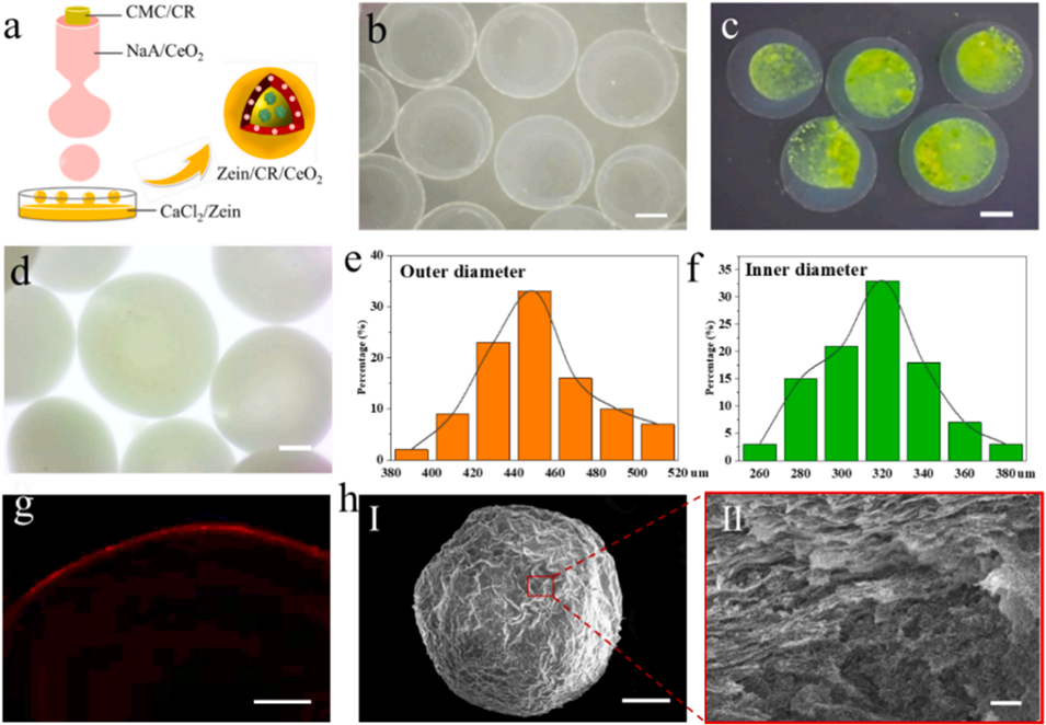 2、该微球以玉米醇溶蛋白为保护外壳,内部核壳结构分别包裹微藻(Chlamydomonas reinhardtii)和二氧化铈纳米酶。