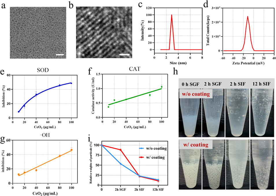 CeO2纳米酶具有类SOD、CAT和•OH清除活性,显著降低巨噬细胞和肠道组织中的ROS水平,抑制炎症因子(TNF-α、IL-6)分泌。