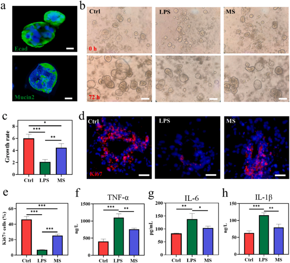 体外验证:抑制肠道类器官炎症反应,促进上皮增殖(Ki67表达增加)。