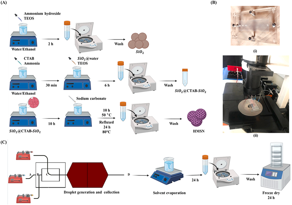 图1.(A)HMSNs合成示意图(使用BioRender.com创建),(B)微流控装置(i)制备和粘接后(ii)测试设置,(C)PLGA-HMSN复合微球的生成(使用BioRender.com创建)。