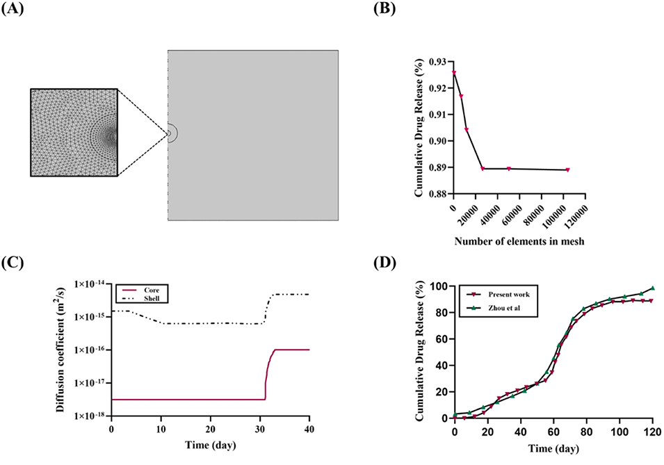 图2.(A)PLGA-HMSN模拟的对称二维几何结构及其周围环境和非结构化网格,(B)网格独立性验证,(C)核(HMSN)和壳(PLGA)的扩散系数随时间的变化,(D)通过与Zhou等人的实验结果对比,验证了模拟的准确性。