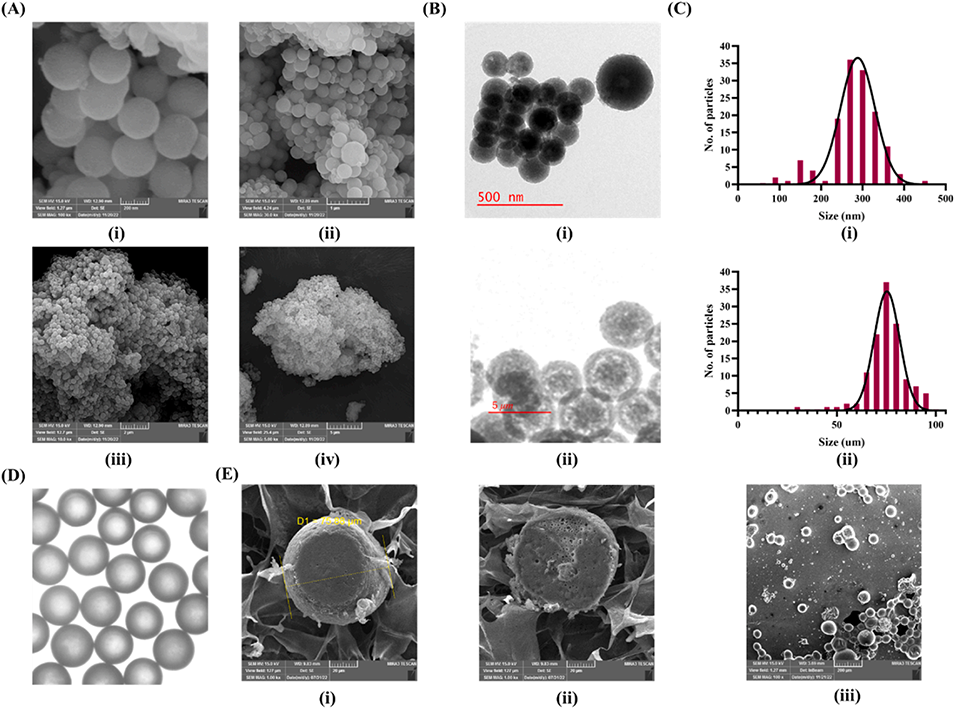 图4.(A)HMSNs的FESEM图像,放大倍数分别为(i)200nm、(ii)1μm、(iii)2μm和(iv)5μm,(B)HMSNs的HRTEM图像,分别为(i)500nm和(ii)5μm,(C)样品(i)HMSNs和(ii)PLGA-HMSN的直径直方图,(D)PLGA-HMSN的光学显微镜图像,(E)(i)PLGA-HMSN的FESEM图像、(ii)PLGA-HMSN的横截面形态和(iii)PLGA-HMSN微球的HRTEM图像。