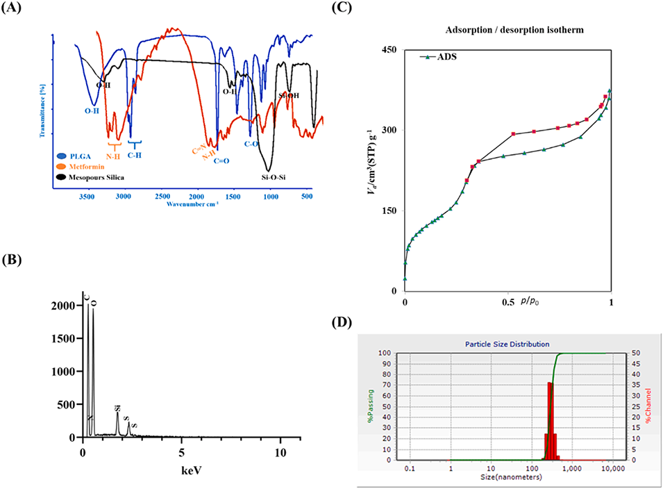 图3.(A)Met、Met@HMSN和Met@PLGA-HMSN的红外光谱,(B)EDX分析,(C)BET分析,(D)DLS分析。