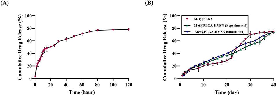 图6.(A)HMSNs中Met的释放曲线,(B)PLGA和PLGA-HMSN中Met的实验和模拟释放曲线。