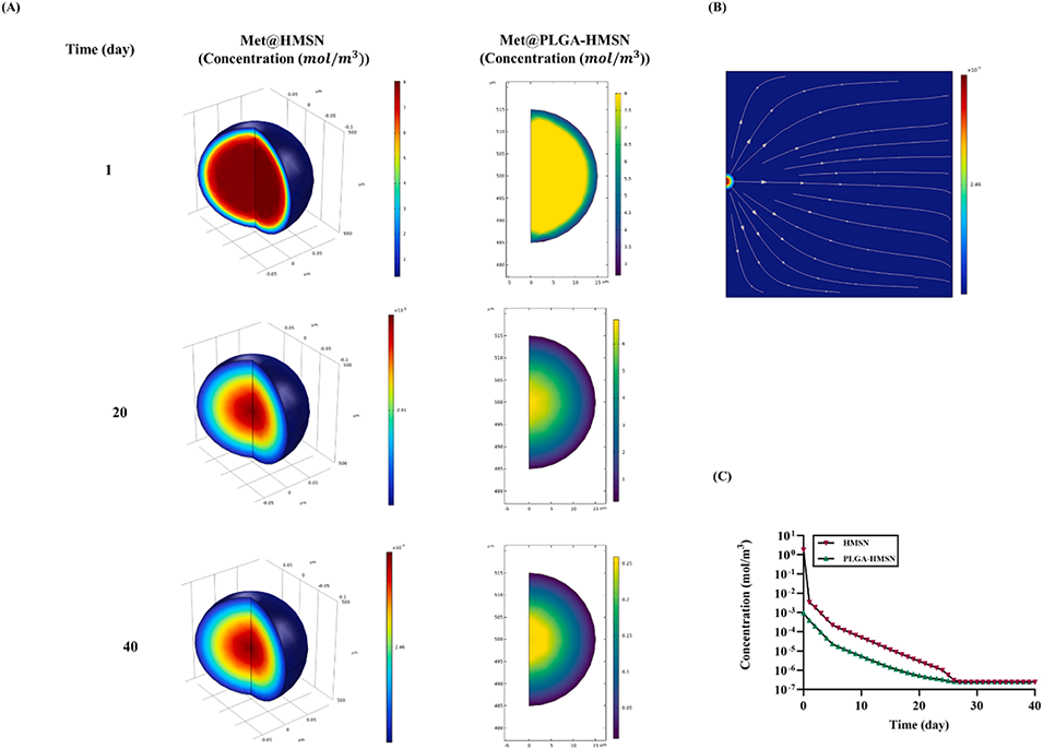 图7.(A)HMSN和PLGA-HMSN中随时间变化的药物浓度,(B)释放介质中药物浓度分布路径,(C)载体中药物浓度随时间变化的示意图。