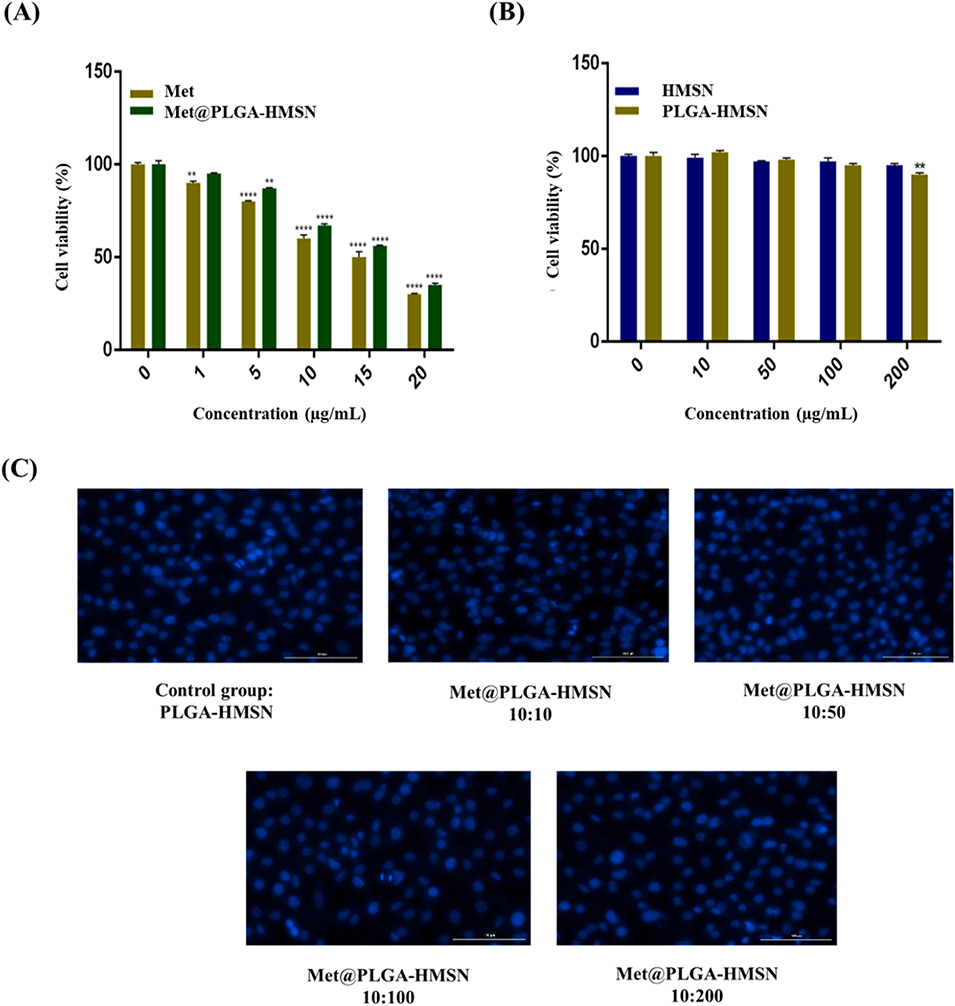 图8.比较不同浓度下(A)游离药物和载药PLGA微载体,(B)HMSNs和HMSN-PLGA微载体对细胞活性的影响(24小时),(C)DAPI染色测定Met@PLGA-HMSN在不同浓度二甲双胍:微球(mg/mL)下对C28细胞的细胞毒性。