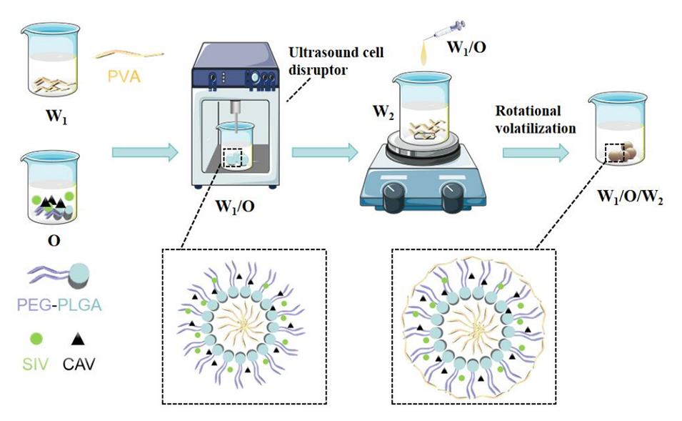 2、通过乳化-溶剂蒸发技术制备的微球具有高包封率和小粒径(平均4.25 μm),体外实验显示25天内SIV和CAV累积释放率分别达88.91%和89.35%。