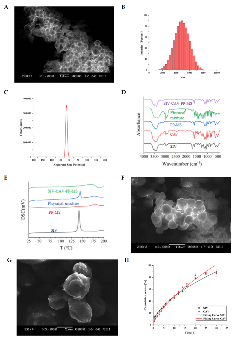 图2.SIV-CAV-PP-MS的SEM图像(A)。SIV-CAV-PP-MS的粒径分布(B)。SIV-CAV-PP-MS的Zeta电位(C)。傅里叶变换红外光谱分析(D)。差分扫描热分析(E)。SIV-CAV-PP-MS的扫描电镜((F):第1天,(G):第30天)。SIV-CAV-PP-MS在含0.5%SDS(H)的PBS(pH7.4)中的体外释放拟合曲线。