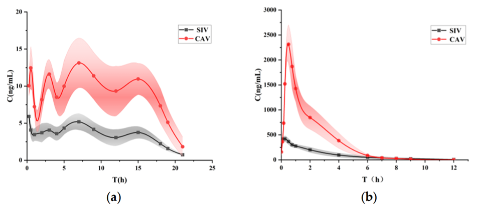 图3.注射SIV-CAV-PP-MS后大鼠的血浆浓度-时间曲线(a)。注射SIV-CAV混悬液后大鼠的血浆浓度-时间曲线(b)。注:半透明区域是图形的误差带。
