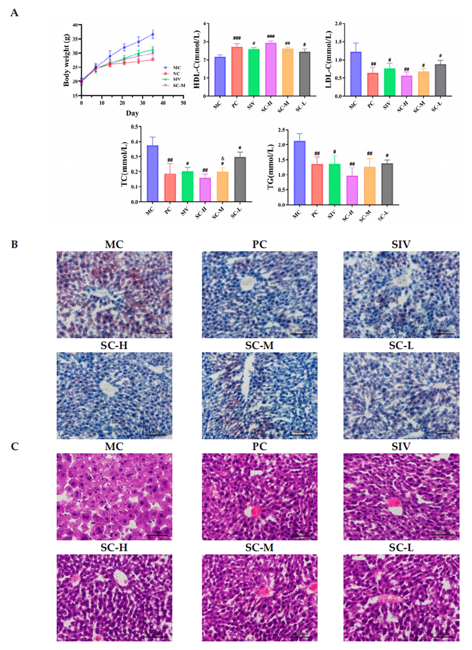 图4.SIV-CAV-PP-MS对血脂水平的影响。与MC相比,#p<0.05,##p<0.01,###p<0.01;与SIV相比,p<0.05(A)。小鼠肝组织油红O染色(B)和小鼠肝组织H&E染色(C)。