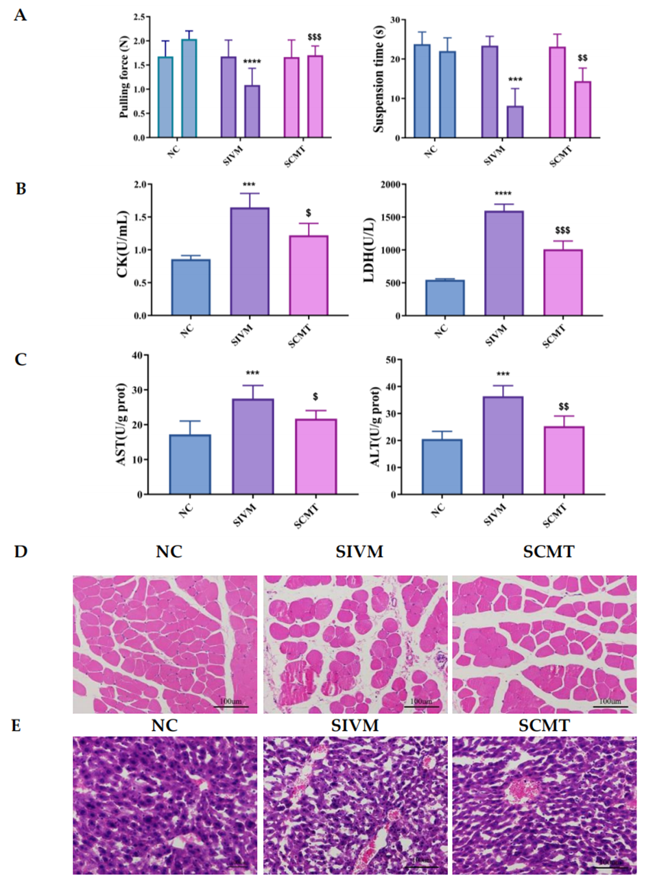 图5.小鼠运动能力评估(A)。CK和LDH检测水平(B)。AST和ALT检测水平(C)。小鼠肌肉组织的H&E染色(D)和小鼠肝组织的H&E染色(E)。与NC相比,***p<0.001,****p<0.0001;与SIVM相比,$p<0.05,$$p<0.01,$$$p<0.001。