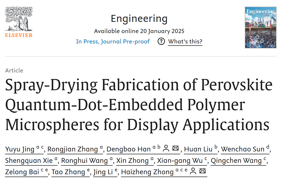 喷雾干燥技术因其高效连续特性,在功能粉末规模化制备中备受关注。近期,北航合肥创新研究院韩登宝博士、北京理工大学钟海政教授等通过优化前驱体溶液配比及喷雾干燥工艺,成功实现了钙钛矿量子点(PQD)嵌入聚合物微球的规模化制备(年产量达2000公斤),并系统验证了其光学性能与稳定性。相关研究以“Spray-Drying Fabrication of Perovskite Quantum-Dot-Embedded Polymer Microspheres for Display Applications”为题目,发表在期刊《Engineering》上。