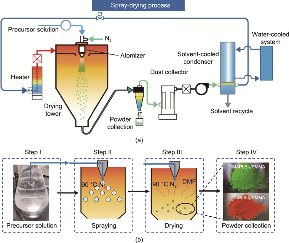 1、一步法封装:将PQD前驱体、聚合物(如PMMA)及配体溶于DMF形成均匀溶液,雾化后高温快速干燥(110–130°C),实现PQD原位结晶与聚合物基质的同步封装,避免后处理步骤。