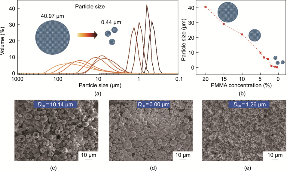 图3.(a)使用喷雾干燥法获得的MAPbBr3/PMMA PQD微球的粒径。变量是前体溶液中PMMA浓度的(下降)变化。(b)微球粒径与前体溶液中PMMA浓度之间的关系。(c–e)D50粒径为10.14、6.00和1.26μm的MAPbBr3/PMMA PQD微球的典型SEM图像。