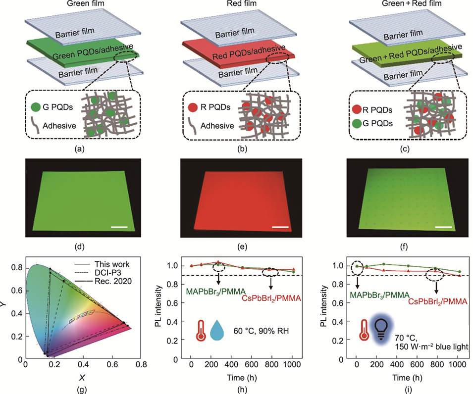 图4.(a–c)封装PQD光学薄膜的结构示意图:(a)MAPbBr3/PMMA PQD微球的绿色薄膜;(b)CsPbBrI2/PMMA PQD微球的红色薄膜;以及(c)混合MAPbBr3/PMMA和CsPbBrI2/PMMA PQD微球的绿色和红色薄膜。插图是PQD球体和粘合剂混合物的示意图,G和R分别代表绿色和红色。(d–f)365 nm光下(d)绿色薄膜、(e)红色薄膜以及(f)绿色和红色薄膜的光学图像(比例:5 cm)。(g)PQD薄膜集成LCD背光的色域覆盖。(h)PQD光学薄膜在60°C和90%RH下老化1000小时的稳定性测试。(i)PQD光学薄膜在70°C、150 W·m-2、455 nm蓝光照射下老化1000小时的稳定性测试。