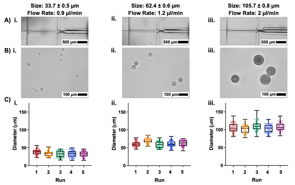 2、采用微流控技术调控分散相流速(0.9–2.0 μL/min),成功制备了尺寸精确可控的微粒,直径分别为33.7±0.5、62.4±0.6和105.7±0.8 μm,满足不同生物医学应用的需求。