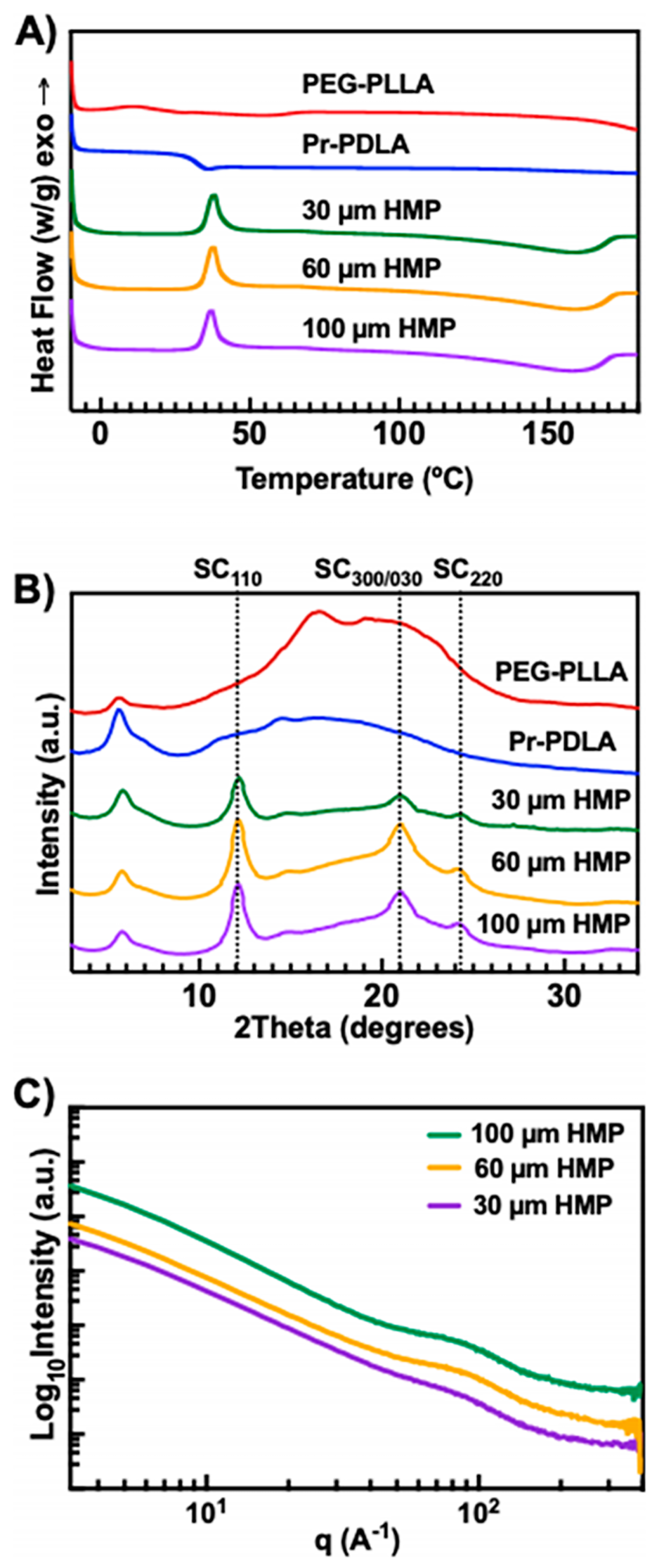 图4.SC-HMPs的热性能与散射分析:(a)DSC热谱显示SC-HMPs在37°C出现结晶放热峰;(b)WAXS谱中SC-HMPs在2θ=12.2°、21.2°、24.2°处显示立体复合PLA的特征衍射峰;(c)SAXS谱表明不同粒径SC-HMPs的网状结构孔径(7.9–9.1 nm)差异较小。