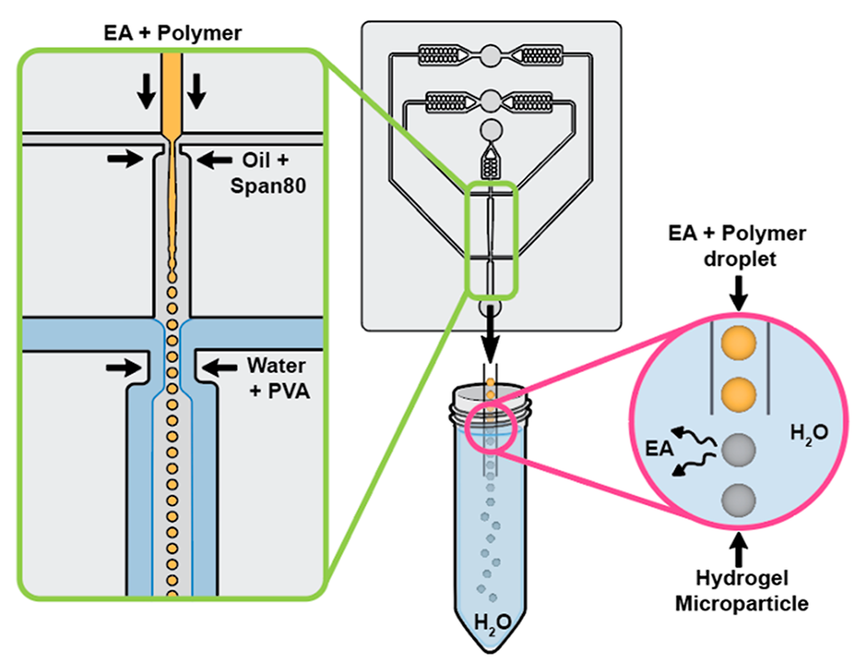 图2.微流控制备SC-HMPs的流程:PDMS微流控芯片引导有机相(10 wt%聚合物前体/乙酸乙酯)、油相(3 vol% Span80/矿物油)和水相(9 wt% PVA/去离子水)形成“水包油包有机相(Org/O/W)”双乳液。分散相通过尖端流动形成稳定液滴,水相触发立体复合凝胶化,最终液滴在去离子水中完成固化。