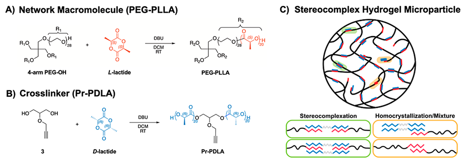 图1.(a)通过L-丙交酯开环聚合合成的等规聚L-乳酸(PLLA)功能化4臂聚乙二醇(PEG-PLLA)星形聚合物;(b)通过D-丙交酯开环聚合合成的炔基功能化等规聚D-乳酸(Pr-PDLA)交联剂。(c)聚合物前体在微流控通道中自组装形成立体复合水凝胶微粒(SC-HMP),其中PLLA链与PDLA寡聚物通过立体复合作用形成物理交联网络。通过使用低分子量PLLA/PDLA及“水包油包有机相”条件抑制同构结晶。
